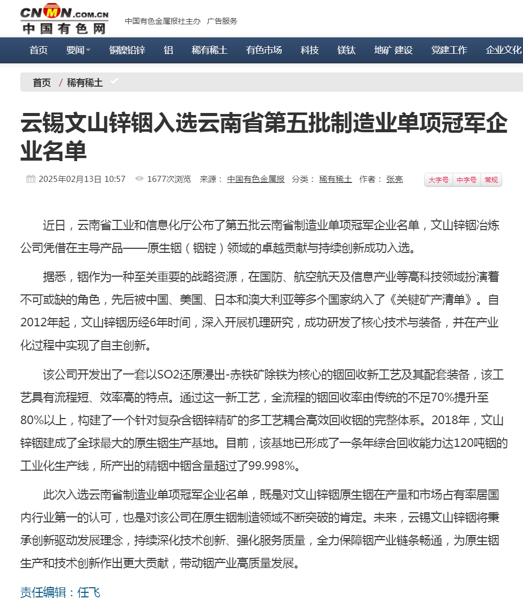 中國有色網:文山鋅銦入選云南省第五批制造業單項冠軍企業名單